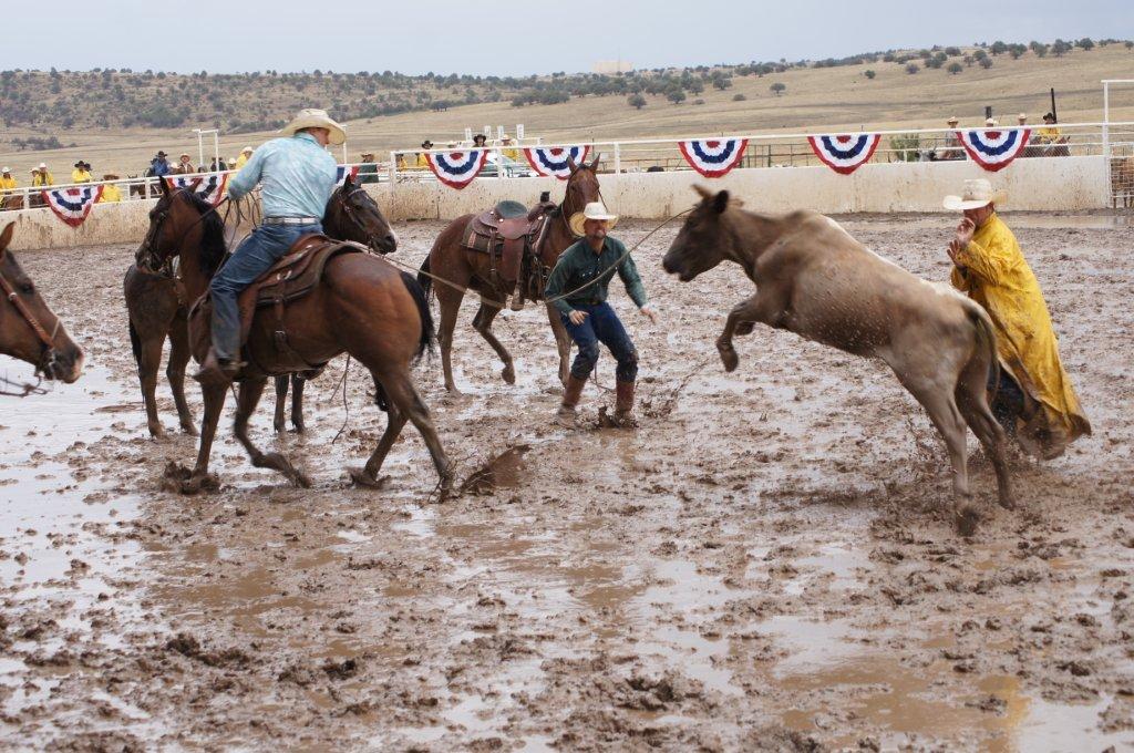 The adult ranch rodeo was held over two days on Friday and Saturday afternoons due to the large number of teams. The weather remained consistently uncooperative by continuing with the thunder, lightning and pouring rains beginning in the early afternoons. Thank goodness the metal stands were covered but it still got a little nerve racking for us spectators with the lightning. I never heard a complaint from anyone however. The closest thing I ever heard was a hope that it was raining as hard at their home ranch as it was here at the fairgrounds. The rodeo began each day with the national anthem being sung by the contestants and the Capitan grandstand choir. Not a verse was missed nor a heart not covered either by a cowboy hat or a hand. By 1:00 pm the arena was a deep, muddy, slick mess with thick soupy puddles in several spots. It was chilly, raining and windy but the judges in their slickers were mounted on their horses and in the arena ready to judge the first event when we finally decided to leave the dry comfort of our trucks in the parking lot and make a dash for the grandstands during a slight let-up of the rain. This was after everyone frantically searched for protection – umbrellas, slickers, jackets, sweatshirts, things that we haven’t needed for the past 2 years!!